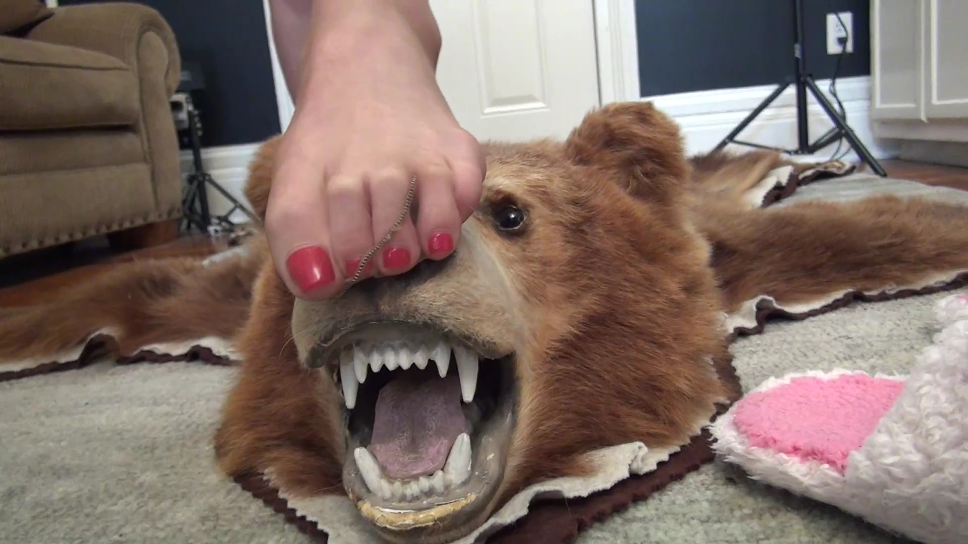 Kookie is dressed in a nice dress and thin nylons, she is wearing her comfy pig slippers, Kookie feels so sorry for the poor bear head. After a while she decides to trample it with her bear feet. She takes off her slippers so she can rub her nylons right on his head. She starts rubbing her soles on the nose of the bear, Kookie gets so excited and starts moaning and grouping her breast as she finishes rubbing.
